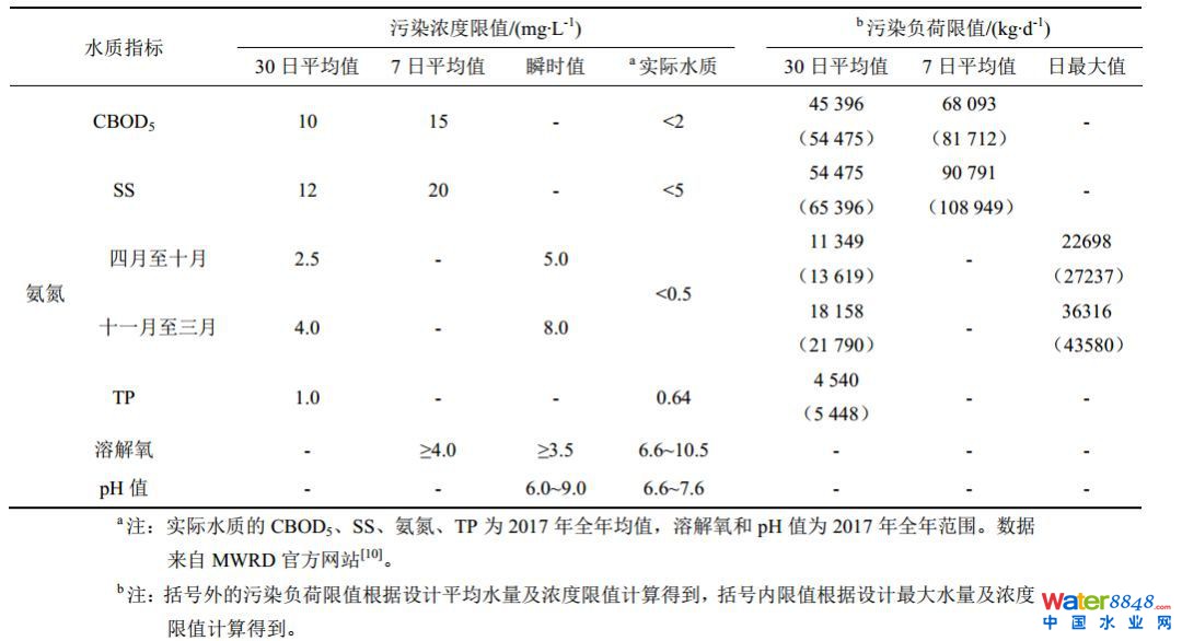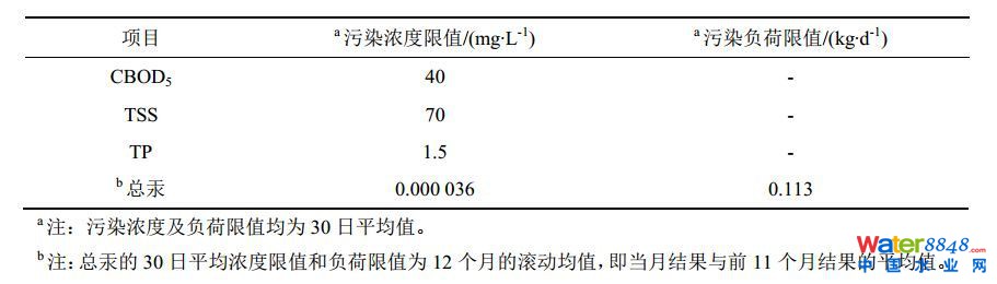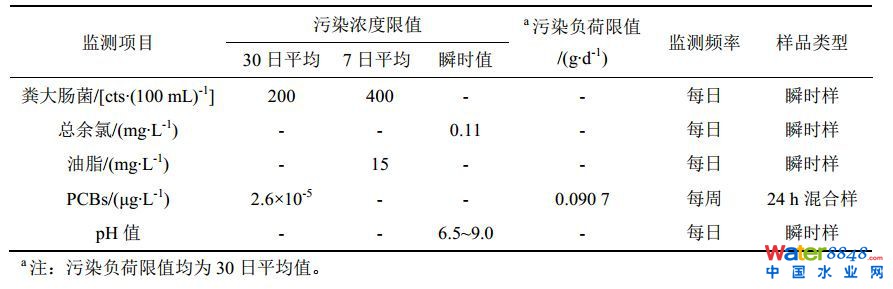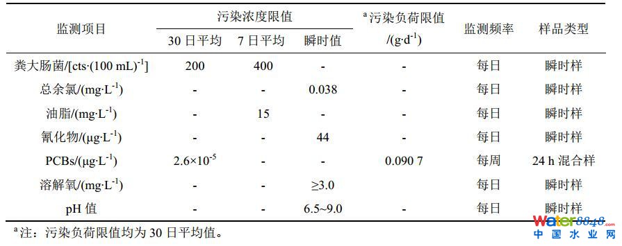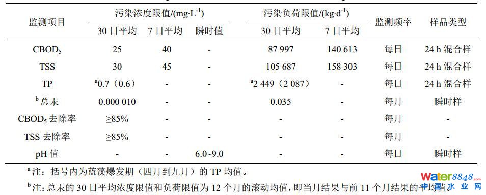 對于二級處理后尾水的水質(zhì)監(jiān)測點049B,排放許可證不僅對尾水污染物的濃度進(jìn)行控制,對水體造成的污染物負(fù)荷也有限制。其污染物控制指標(biāo)及排放限值如表2所示。除上述許可證規(guī)定的污染物排放限值外,底特律污水處理廠還須向環(huán)境質(zhì)量部門報告監(jiān)測點049B每日的處理水量、CBOD5濃度、TP濃度、氨氮濃度、總汞濃度等數(shù)據(jù),以及每月水量、氨氮濃度、總汞濃度及負(fù)荷的日平均值。