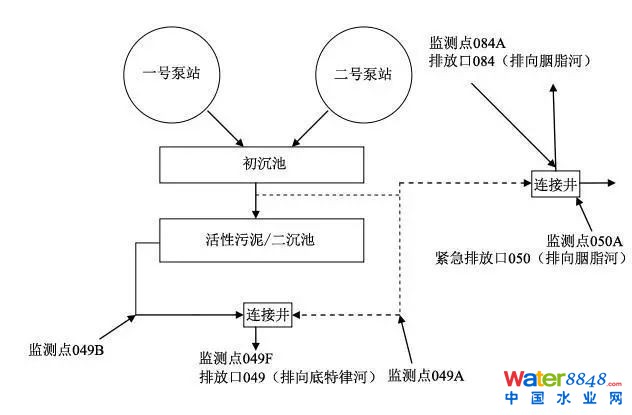 如圖2所示,該廠的尾水排放共設(shè)有5個水質(zhì)監(jiān)測點,分別為049A、049B、049F、050A和084A。其中,監(jiān)測點049A監(jiān)測雨季未經(jīng)二級處理的尾水水質(zhì),049B監(jiān)測經(jīng)污水處理廠完全處理后的尾水水質(zhì),049F監(jiān)測049A與049B的混合水質(zhì),050A監(jiān)測雨季未經(jīng)二級處理且由排放口050排放的尾水水質(zhì)。許可證對每個監(jiān)測點控制的污染物類別和限值不盡相同。此外,不同水質(zhì)項目對30日平均值、7日平均值和瞬時值也有不同要求,主要監(jiān)測項目的限值以30日平均值和7日平均值為主。