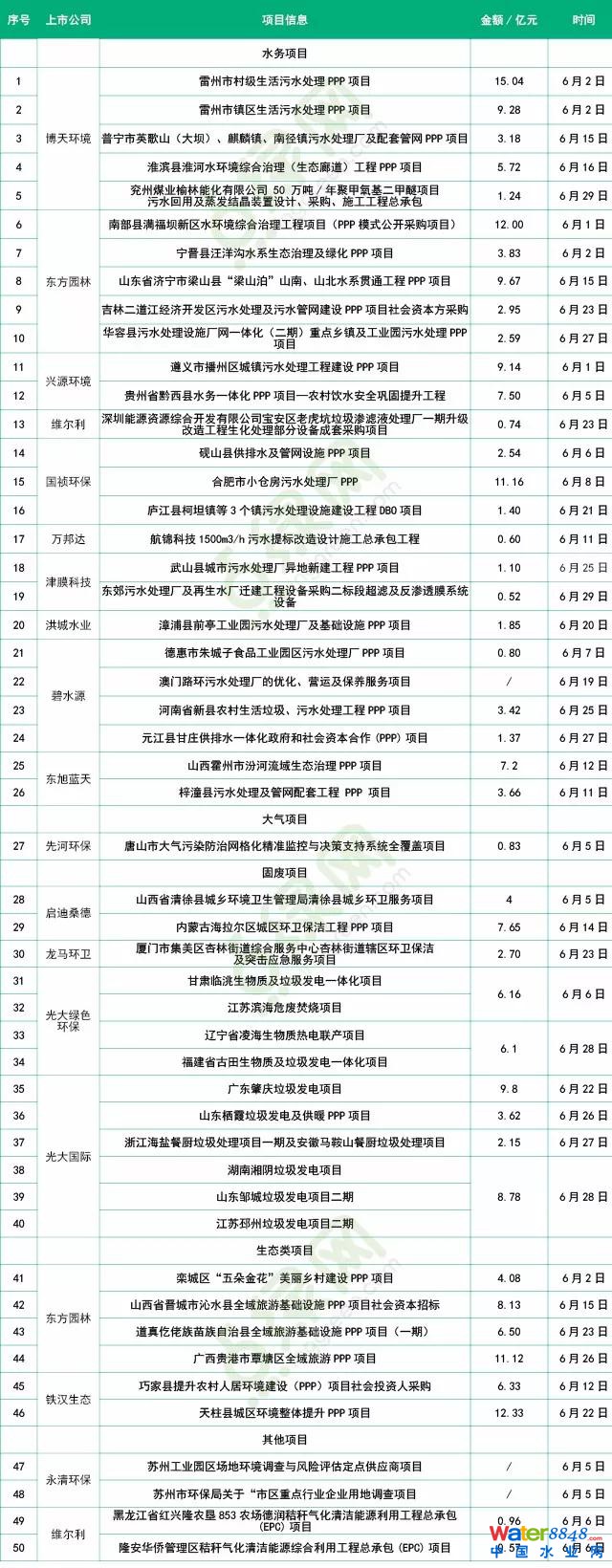 水務(wù)項(xiàng)目逐漸占據(jù)大半江山,共26個(gè)占比52%。其中,博天環(huán)境、東方園林分別中標(biāo)5個(gè)項(xiàng)目,涉及總投資分別為34.46億元和31.04億元。此次水務(wù)項(xiàng)目總投資最高的為博天環(huán)境的村級(jí)生活污水處理項(xiàng)目,涉及金額為15.04億元。