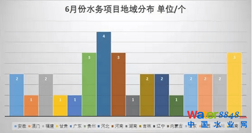 據(jù)不完全統(tǒng)計,6月份上市企業(yè)共拿下32個水領(lǐng)域項目,金額達(dá)148.85億。相較于5月份的152.07億,環(huán)比下降2.12%。地域分布上,6月份項目相對集中于河南、河北、貴州、云南4省。
