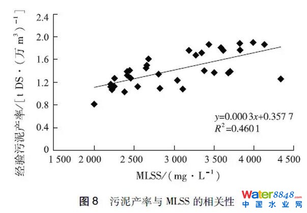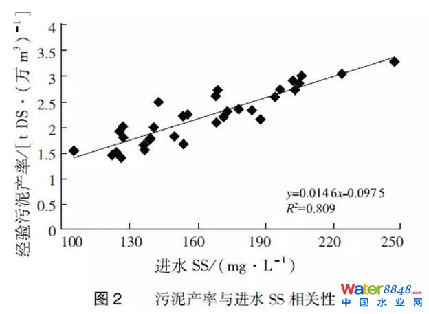 (2)經(jīng)驗(yàn)污泥產(chǎn)率與進(jìn)水有機(jī)物含量和懸浮固體濃度呈顯著正相關(guān)性,冬春季進(jìn)水SS和BOD5濃度較高,而夏秋季進(jìn)水SS和BOD5濃度較低,這可能是污泥產(chǎn)率呈現(xiàn)季節(jié)性波動的主要原因。