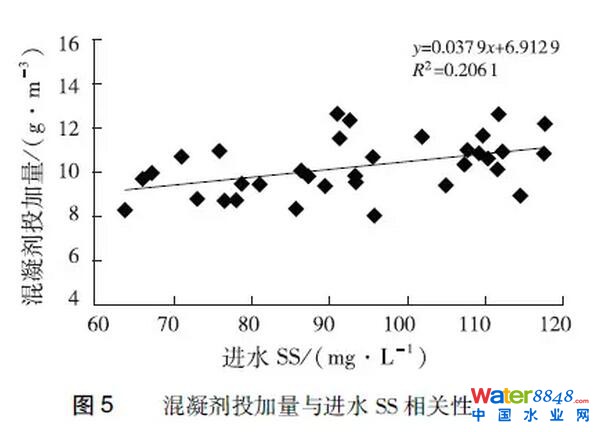 常州QT污水處理廠是典型的進(jìn)水以生活污水為主的污水處理廠,進(jìn)水SS和BOD5均呈現(xiàn)出顯著的季節(jié)規(guī)律性(圖4),冬春季進(jìn)水SS和BOD5濃度較高,而夏秋季進(jìn)水SS和BOD5較低,這可能是污泥產(chǎn)率呈季節(jié)性波動的主要原因。此外,研究還發(fā)現(xiàn),該廠污水處理單元混凝劑投加量與進(jìn)水SS呈正相關(guān)性(圖5),進(jìn)水SS較高時(shí)一般會投加更多混凝劑,產(chǎn)生更多的化學(xué)污泥,這進(jìn)一步增大了污泥產(chǎn)率隨SS濃度的波動幅度。