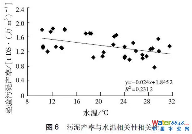 (3)經(jīng)驗(yàn)污泥產(chǎn)率與水溫呈負(fù)相關(guān)性,我國大部分區(qū)域溫度季節(jié)變化顯著,污泥產(chǎn)率隨水溫變化相應(yīng)產(chǎn)生波動,這可能是污泥產(chǎn)率呈現(xiàn)季節(jié)規(guī)律性的原因之一。
