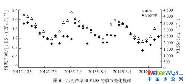 (4)為保證低溫硝化效果,污水處理廠通常會在冬季提高生化反應(yīng)池MLSS濃度,微生物量越多產(chǎn)生的污泥量相應(yīng)越多,這可能是冬季污泥產(chǎn)率較高的另一原因。