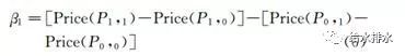 其中,Price(PR,T)代表房屋價(jià)格。R表示區(qū)域。目標(biāo)組(污水處理廠周邊)取R=1,對(duì)照組取R=0。T表示時(shí)間。2016年取T=0,2017年取T=1。DRT=R×T,是區(qū)域虛擬變量和時(shí)間虛擬變量的交叉項(xiàng)。ε是隨機(jī)誤差項(xiàng),服從標(biāo)準(zhǔn)正態(tài)分布。β1為希望獲取的參數(shù),即房?jī)r(jià)影響值,其數(shù)值反映了污水處理廠對(duì)周邊房?jī)r(jià)增速的影響。該值為正代表對(duì)房?jī)r(jià)的促進(jìn),該值為負(fù)代表對(duì)房?jī)r(jià)增長(zhǎng)的抑制。因此:
