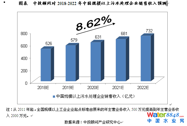 2016年,我國規(guī)模以上污水處理企業(yè)銷售收入達(dá)到了442.78億元,相比上年增長4.52%。我們預(yù)計(jì),2018年我國規(guī)模以上污水處理企業(yè)銷售收入將達(dá)到526億元,未來五年(2018-2022)年均復(fù)合增長率約為8.62%,2022年將達(dá)到732億元。