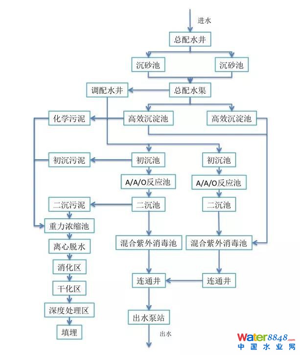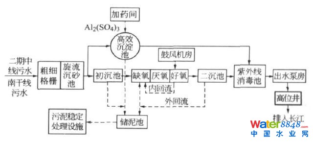 該廠的污水處理采用多模式厭氧/缺氧/好氧( A/A/O) 工藝,進水經(jīng)泵站提升后以重力流進入總配水井,經(jīng)8組粗細格柵和旋流沉砂池預(yù)處理后,進入多模式A/A/O處理單元,二沉池出水采用紫外線消毒;還有部分污水經(jīng)預(yù)處理后,進入高效沉淀池,通過外加藥劑處理后同樣紫外消毒,出水經(jīng)出口泵房通過深水排放管排入長江。
