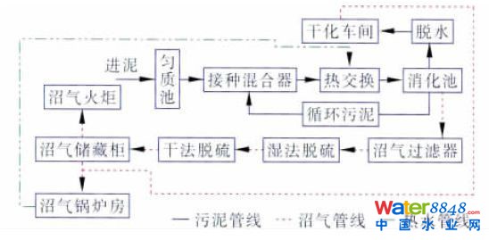 采用單級中溫厭氧消化,厭氧發(fā)酵后甲烷桿菌產(chǎn)生沼氣,經(jīng)過干式和濕式脫硫法,去除里面的硫化氫等雜質(zhì)得到純凈的甲烷氣體,備用給第四個區(qū)域干化區(qū)。