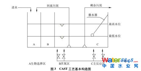 SBR工藝也稱為序批式間歇式反應(yīng)器法[17]主要包括進水、曝氣、沉淀、排水、待機五個過程,限制曝氣進水與非限制曝氣進水是兩種基本的運行方式且該工藝不會發(fā)生污泥膨脹.根據(jù)運行方式改進后具有除磷脫氮功能的主要有ICEAS、DAT-IAT(曝氣池+反應(yīng)池)工藝、CASS工藝等.國際上較多的中小型污水處理廠常采用CAST工藝,循環(huán)曝氣活性污泥法CAST是SBR工藝的變型工藝,屬于間歇式活性污泥法.與傳統(tǒng)SBR相比,CAST池在主反應(yīng)池前端設(shè)置生物反應(yīng)器用于污泥回流,污泥回流泵將主反應(yīng)區(qū)的活性污泥回流到生物選擇器中,圖3為CAST工藝構(gòu)造圖.生物選擇器中溶解氧濃度低于0.5mg/L,選擇器呈缺氧-厭氧環(huán)境狀態(tài).SBR工藝及其改良工藝在我國浙江遵義市污水處理廠、河南山陽縣污水處理廠、江西宜賓市南岸污水處理廠及四川五通橋區(qū)污水處理廠(二期)等均有應(yīng)用.
