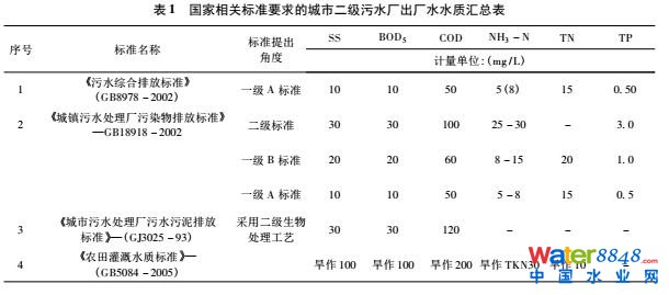 表1為國家相關(guān)標(biāo)準(zhǔn)對二級污水處理廠的出水水質(zhì)要求,隨著“十二五”節(jié)能減排目標(biāo)的推進,我國對城市污水處理廠出水水質(zhì)的標(biāo)準(zhǔn)不斷提高,《城鎮(zhèn)污水處理廠污染物排放標(biāo)準(zhǔn)》規(guī)定,城鎮(zhèn)污水處理廠出水排入國家和省確定的重點流域及湖泊、水庫等封閉、半封閉水域時,執(zhí)行一級A標(biāo)準(zhǔn).基于傳統(tǒng)活性污泥法為主要處理工藝的早期投建的城市污水處理廠迫于政策和環(huán)境壓力,對污水處理廠進行提標(biāo)改造勢在必行。