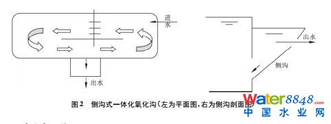 氧化溝工藝作為活性污泥工藝的改型具有構(gòu)筑物簡單、耐沖擊負荷強、處理效果和運行費用低等優(yōu)點[15],在我國的應(yīng)用廣泛,在我國南方城市應(yīng)用較多.圖2為典型側(cè)溝式一體化氧化溝,該裝置混合液在流經(jīng)側(cè)溝時一部分經(jīng)過導(dǎo)流板均勻進入側(cè)溝,固液分離后,上清液通過出水口流走,下沉污泥在重力作用下經(jīng)側(cè)溝自動下滑,回流至主溝,污水經(jīng)過如此循環(huán)而得到凈化,并能取得較好的脫氮效果[16].從處理效果上講,氧化溝工藝的工程應(yīng)用效果比較可觀.昆明市第一污水處理廠的運行效果表明,TN去除率可以達到70%,TP去除率近90%左右.對于新型氧化溝,如DE型氧化溝和三溝式氧化溝也有相關(guān)的工程應(yīng)用實例,更適于中高污染物濃度的中小型城市污水處理,效果較好,如四川省新都污水處理廠,出水中TP濃度達到0.5mg/L以下.我國四川新都污水處理廠、山東梁山縣污水處理廠、北京大興縣黃村污水處理廠等目前都在運用此工藝.