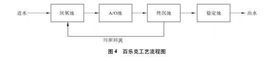 懸鏈?zhǔn)交钚晕勰喙に囈脖环Q作百樂克工藝(BLOLAK),該工藝作為活性污泥處理特色系統(tǒng),已經(jīng)在國內(nèi)外有了廣泛的應(yīng)用,積累了豐富的實踐經(jīng)驗,技術(shù)成熟,不僅可以達到去除有機物的目的,也能滿足污水對氮磷指標(biāo)的排放要求,圖4為百樂克工藝流程.懸鏈?zhǔn)交钚晕勰喙に嚨姆磻?yīng)池型比較靈活,可以根據(jù)地形,采用投資低廉、池易于開挖的土地結(jié)構(gòu),鋪設(shè)HDPE防滲透膜以保護地下水與污水的隔絕.但該工藝降低了土地利用率,適用于工廠企業(yè)的生產(chǎn)廢水處理,投資少,效率高.九臺市污水處理廠(1.0×104m3/d),2009年投入使用,污泥負荷過低,反應(yīng)停留時間長達20h,經(jīng)過控制參數(shù)調(diào)整,運行效果良好,可以達標(biāo)。