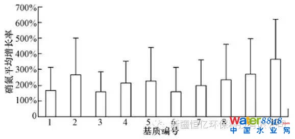 硝態(tài)氮主要依靠厭氧微生物的反硝化作用,以及部分硝態(tài)氮的過濾和吸附作用被截留而得以去除,其中微生物的作用占主要地位.如圖 5所示,每個基質(zhì)試驗柱的出水中,硝態(tài)氮的濃度均有不同程度的增長,且經(jīng)原始生物陶;|(zhì)處理后的出水中,硝態(tài)氮的平均增長率均要高于其它改性基質(zhì).經(jīng)分析發(fā)現(xiàn),這一現(xiàn)象產(chǎn)生的原因可能是試驗系統(tǒng)的水力停留時間較短,且基質(zhì)試驗柱內(nèi)缺乏厭氧環(huán)境,反硝化作用難以進行,以至于硝態(tài)氮的積累所導(dǎo)致的.