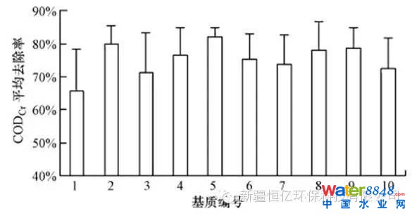 由圖 2可知,總體上原始生物陶;|(zhì)及9種改性基質(zhì)對CODCr均有較好的處理效果.原始生物陶粒基質(zhì)對CODCr的平均去除率達到72%,而大多數(shù)改性基質(zhì)對CODCr的平均去除率都有提高,其中5號(ZnCo-LDHs)對CODCr的平均去除率達到82%,且處理效果穩(wěn)定;2號(ZnFe-LDHs)平均去除率也達到79%.進行9種改性基質(zhì)與原始基質(zhì)對CODCr去除的顯著性分析可發(fā)現(xiàn),5號(ZnCo-LDHs)改性基質(zhì)對CODCr的去除率影響差異顯著(p<0.05).