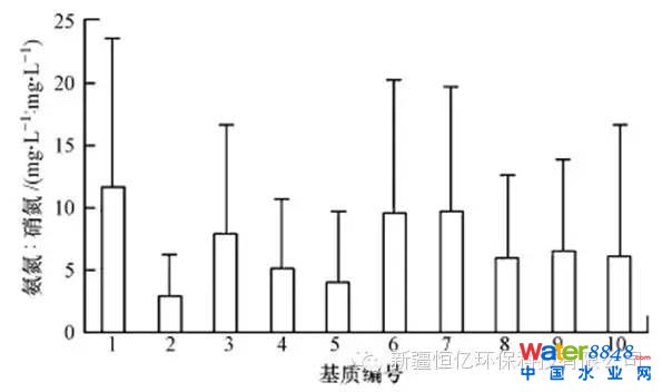 通過對各基質(zhì)試驗柱出水中氨氮與硝氮比值的分析可以發(fā)現(xiàn)(圖 6),原水中氨氮與硝氮比值高達79.09,而通過原始基質(zhì)及9種改性基質(zhì)凈化實驗后,出水中氨氮與硝氮比值明顯降低.其中2號(ZnFe-LDHs)、5號(ZnCo-LDHs)比值分別降為2.85和4.01,均低于原始基質(zhì)出水中氨氮與硝氮的比值;其它改性基質(zhì)試驗柱出水中的氨氮與硝氮比值大小與對應(yīng)氨氮的平均去除率呈負(fù)相關(guān).
