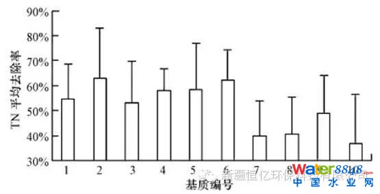 人工濕地脫氮過程是由基質(zhì)、植物和微生物通過物理、化學(xué)及生物過程的協(xié)同作用而完成的,微生物的氨化、硝化和反硝化過程是氮的主要去除途徑.生物膜對氮的去除主要包括菌群對氮的吸收、固定,好氧、缺氧、厭氧的生物轉(zhuǎn)化,以及惰性有機物質(zhì)或顆粒物質(zhì)結(jié)合在一起的氮沉積于生物膜表面得到去除.4號、5號、6號改性基質(zhì)對TN的去除效果較好,這說明Co3+和Zn2+的加入有效的促進了微生物對氮素的降解過程;且LDHs改性后基質(zhì)具有較好的覆膜效果,也為微生物提供了更多的附著場所;在吸附和物理截留方面,由于改性后在基質(zhì)表面附著的LDHs具有多微孔結(jié)構(gòu),促進了基質(zhì)對小粒徑懸浮物的吸附和截留,進一步提高了TN的去除效果.