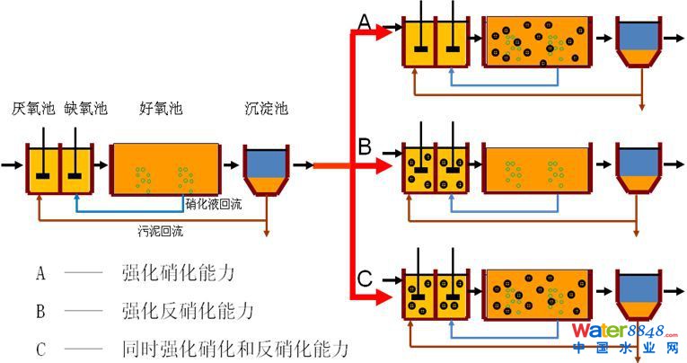 MBBR是一種純生物膜工藝,它依靠懸浮填料上的生物膜來處理污水,無需污泥回流。在MBBR應(yīng)用的演化過程中,尤其在國(guó)內(nèi)大型市政污水廠對(duì)原生物池的提標(biāo)改造中,眾多案例采用了向部分生物池(一般是好氧池)中投加懸浮填料,而仍進(jìn)行污泥回流的方式。這種提標(biāo)改造方案在概念上延用了MBBR的名稱,但實(shí)質(zhì)上是生物膜與活性污泥相結(jié)合的運(yùn)行方式。而ISBAS®就是一種懸浮填料生物膜和活性污泥相結(jié)合對(duì)污水進(jìn)行生化處理的方法。