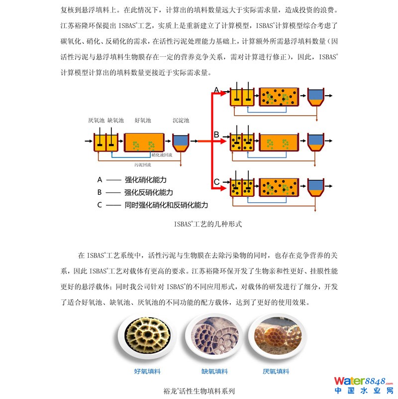 江蘇裕隆環(huán)保有限公司經(jīng)過多年實(shí)踐,對(duì)MBBR工藝進(jìn)行了優(yōu)化,提出了ISBAS®工藝,并申請(qǐng)了工藝專利和商標(biāo)。ISBAS®工藝(Integrated Suspended Bio-film and Activated Sludge Process),即懸浮生物膜與活性污泥復(fù)合工藝,是在活性污泥法基礎(chǔ)上通過投加懸浮填料來增強(qiáng)原有活性污泥池生化處理效果的工藝。