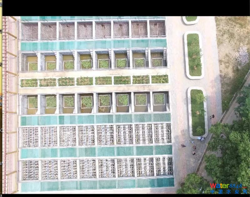人工濕地的前段選用吸污能力較強(qiáng)的水生植物、并選擇過濾空隙率較高的球形填料、半軟性填料等,在后段選擇吸污能力相對較弱,生長速率較慢但根系較為發(fā)達(dá)的親水植物,并設(shè)計過濾空隙率較小的陶粒填料將廢水中懸浮物進(jìn)行充分過濾并利用陶粒表面附著生長的微生物將廢水中的有機(jī)物進(jìn)一步去除,具體方式為,在后段設(shè)置水生浮床或采用鋼架結(jié)構(gòu)架空設(shè)計將陶瓷花壇部分浸泡于水中,使植物根系可直接從廢水中吸收營養(yǎng)。