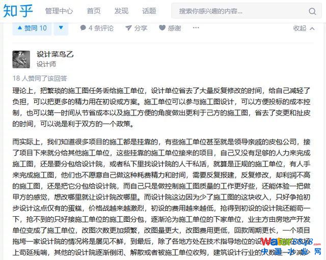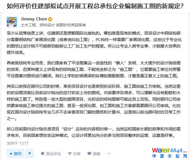 《復(fù)函》的發(fā)布,在業(yè)界牽起了較大的轟動,這改變了我國施工單位和施工圖設(shè)計單位不是同一家單位的現(xiàn)狀,即以后的工程施工圖不用設(shè)計院去畫了,施工單位可以自己搞定。試點的實施,對設(shè)計院有什么影響?我們來看看網(wǎng)友的看法。