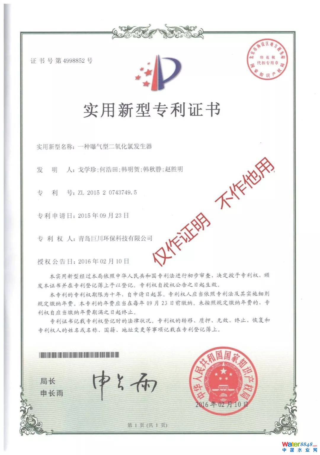 專利展播∣一種曝氣型二氧化氯發(fā)生器(ZL201520743749.5)