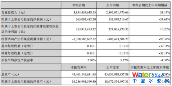 根據(jù)中報披露,碧水源上半年實現(xiàn)營業(yè)收入38.54億元,同比增長33.14%,歸屬上市公司股東的凈利潤為3.65億元,同比下降31.61%。
