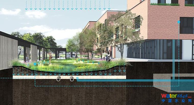 同時,在水池一邊就勢設(shè)置下沉式雨水花園,種植水生、濕生植物,承載周邊匯水區(qū)雨水,就地自然蓄滲,充分發(fā)揮其對雨水的凈化、滯留作用。