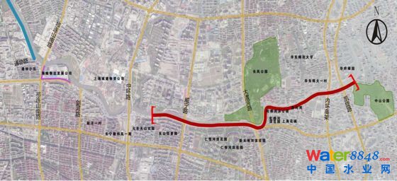 蘇州河慢行步道(一期)東起中山公園3號門,西至雙流路,全長約3.7km。通過對防汛通道、沿河人行步道、沿河公園綠地等濱水岸線景觀等進行改造提升。建設(shè)雨水花園,蓄滲、凈化徑流雨水;對人行步道和局部廣場進行透水鋪裝建設(shè),對駁岸綠化帶進行植草溝+雨水濕地的改造,使雨水得到進一步的沉淀、過濾、凈化和調(diào)蓄。
