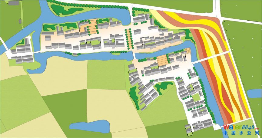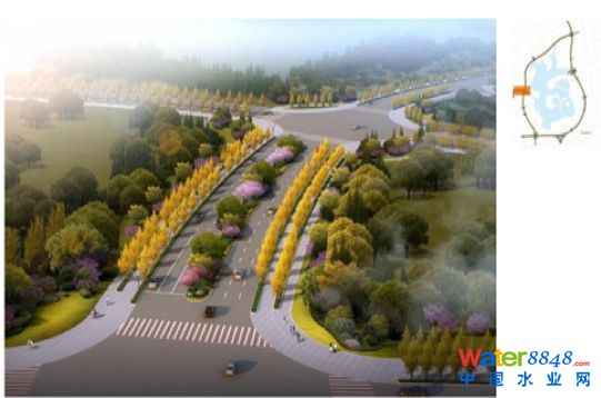 龍耀路以北景觀設(shè)計主要以樹林、草坪、廣場、花園相結(jié)合,使“水系和綠地穿插,汽車、自行車、人與河流并行不悖”。