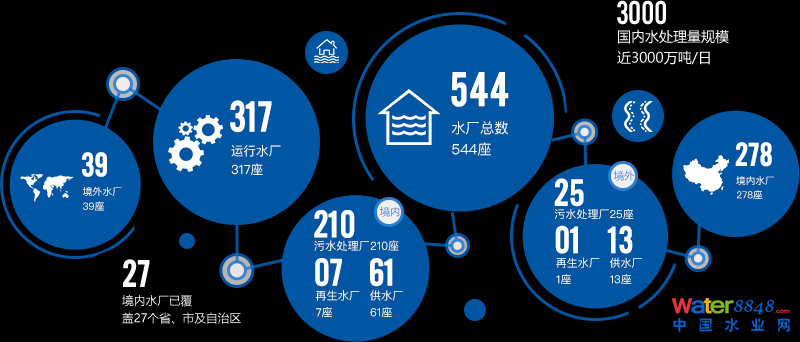 北控水務(wù)先后以PPP、BOT、TOT、委托運(yùn)營(yíng)、股權(quán)收購(gòu)、合資合作等模式,積極拓展城鎮(zhèn)水務(wù)市場(chǎng)。對(duì)水源項(xiàng)目、輸水項(xiàng)目、供水項(xiàng)目、污水項(xiàng)目、再生水項(xiàng)目、管網(wǎng)運(yùn)營(yíng)等提供投資、建設(shè)和運(yùn)營(yíng)管理的綜合解決方案。截至2017 年6月30日,北控水務(wù)國(guó)內(nèi)水處理規(guī)劃規(guī)模近3000 萬噸/ 日,水廠總數(shù)超過540座,境內(nèi)水廠已覆蓋27個(gè)省、市及自治區(qū)。