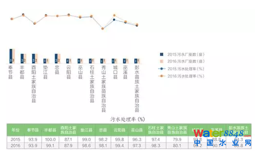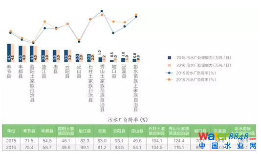 具體而言,2017年重慶以97.3%的污水處理率位居第一,但整體污水廠負荷率高達94.7%,同期全國城鎮(zhèn)污水廠負荷率78.8%。其中污水處理廠處理率低于平均水平但負荷率相對較高的縣城有:彭水苗族土家族自治縣、秀山土家族苗族自治縣、巫溪縣等,負荷率分別為116.1%、115.1%、97.0%。