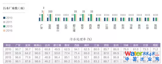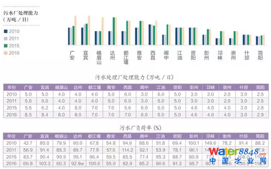 四川76%城市污水處理率高于省平均值(84.4%)。其中什邡、康定、達州、江油等市污水處理率較低,而負荷率分別130.3%、93.4%、92.9%、90.6%。