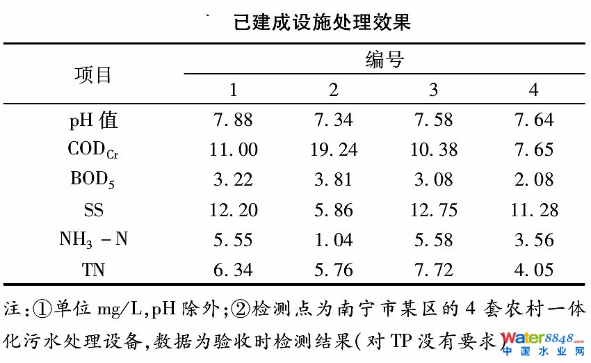 從表中對比可以看出,在農(nóng)村生活污水處理中,選擇投資少、抗沖擊能力好、維護(hù)保養(yǎng)及運(yùn)行費(fèi)用省、技術(shù)操作管理簡單、污水處理效率高的A/0+生物填料一體化污水處理技術(shù)是農(nóng)村污水處理的一種較為理想的選擇。針對目前已建成運(yùn)行的采用A/0+生物填料工藝的幾個一體化污水處理設(shè)備運(yùn)行效果進(jìn)行檢測,結(jié)果發(fā)現(xiàn)出水效果都已達(dá)標(biāo)(TP除外)。