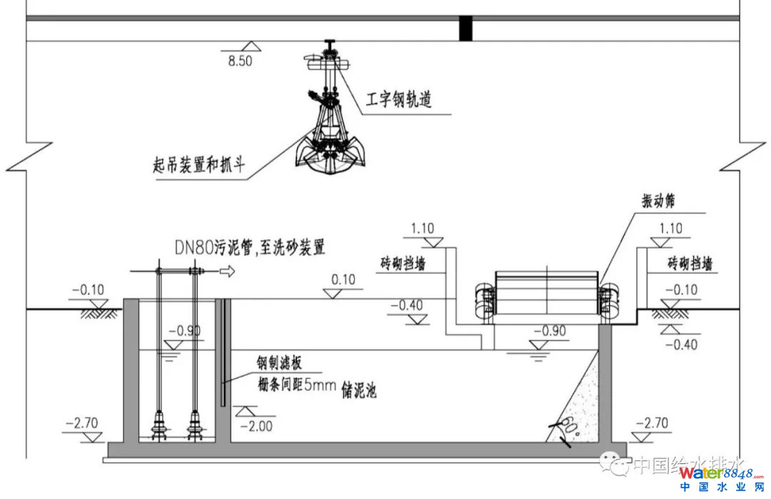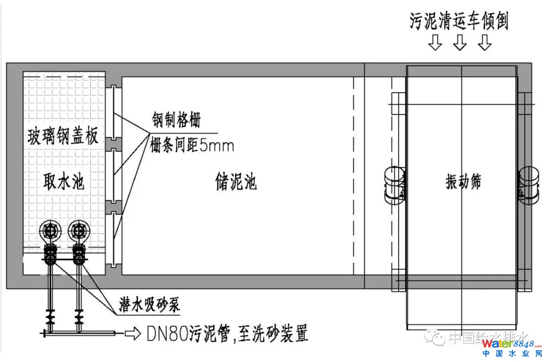 污泥清運車將通溝污泥傾倒至排入半地下通溝污泥儲泥池,設計儲泥量1天污泥量,上覆水平振動篩網(wǎng),將大尺寸的磚塊、樹枝等雜質(zhì)分離。
