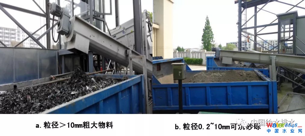 浦東新區(qū)通溝污泥處理工程處理規(guī)模60噸/天,采用多級分離工藝通過篩分+粗大物質(zhì)分離和洗滌+沉砂分離和洗滌工藝,將其分為大型雜物、粗大物質(zhì)(粒徑>10mm,約3~6t/d)、可沉砂礫(粒徑0.2~10mm,約2~5t/d),處理所得干渣平均含水率45%,但處理出水中礦化物質(zhì)(粒徑<0.2mm)含量較高,運行半年以來,泵站進水池已沉積約20m3的砂粒,影響泵站正常運行。浦東新區(qū)通溝污泥處理設備間和分離產(chǎn)物見圖1、2。