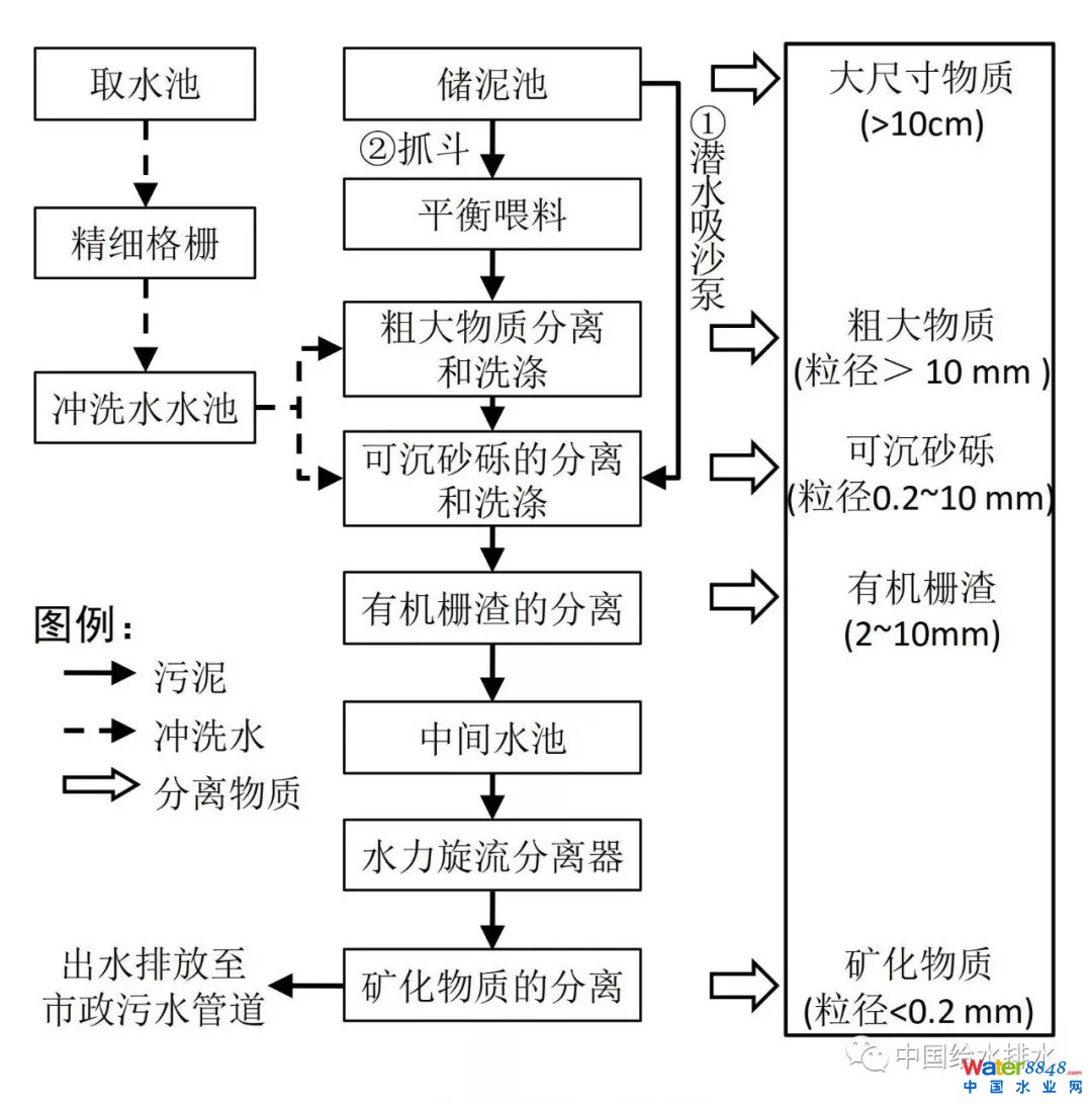 目前對通溝污泥進行專門處理和回用已成為發(fā)展方向。通溝污泥的干固體中有機質(zhì)含量較低,其平均含量約為17.2%,而無機質(zhì) (灰分) 的含量占到了82.8%,顆粒度>0.2mm的顆粒物數(shù)量占70%以上。因此,通溝污泥處理的核心是對其進行分選,通過篩分、洗滌和過濾等預處理手段,將其分為粗大垃圾、細砂、有機污泥、粉砂以及污水五部分,以備進一步處理。粗大垃圾經(jīng)分離后轉(zhuǎn)到垃圾處理部門進一步處理處置和回收利用;可沉砂礫(粒徑0.2~10mm)可用于以用作低檔建材回收利用;礦化物質(zhì)(粒徑<0.2mm)可用作市政道路路基回填砂建回收利用;有機柵渣(2~10mm)可用于污泥堆肥,或作為污水廠的碳源補充至生化處理單元。濾出的污水可通過管道重新輸送至污水處理廠進行處理,也可進一步去除污水中的有機物顆粒以作為通溝污泥處理工藝設備的沖洗水;分離出的污泥可直接脫水后外運處置。