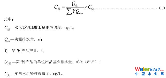 在排污單位的生產(chǎn)設(shè)施同時生產(chǎn)兩種以上產(chǎn)品、可適用不同排放控制要求或不同行業(yè)國家污染物排放標(biāo)準(zhǔn),且生產(chǎn)設(shè)施產(chǎn)生的污水混合處理排放的情況下,應(yīng)執(zhí)行排放標(biāo)準(zhǔn)中規(guī)定的最嚴(yán)格的濃度限值,并按公式(1)換算水污染物基準(zhǔn)排水量排放濃度。