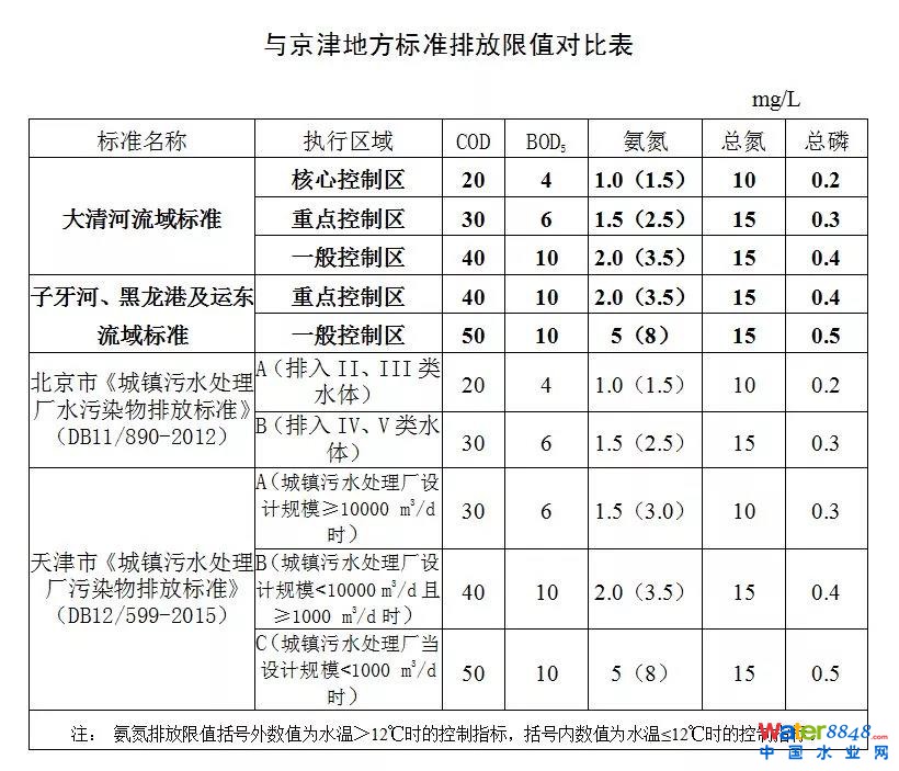 三項(xiàng)流域地方標(biāo)準(zhǔn)分區(qū)域設(shè)定了化學(xué)需氧量、五日生化需氧量、氨氮、總氮、總磷等五項(xiàng)水污染物排放限值(具體指標(biāo)見(jiàn)“與京津地方標(biāo)準(zhǔn)排放限值對(duì)比表”)。大清河流域核心控制區(qū)污染物排放限值與北京標(biāo)準(zhǔn)中最嚴(yán)的A類(lèi)相當(dāng),如COD為20mg/L;重點(diǎn)控制區(qū)排放限值與北京標(biāo)準(zhǔn)中的B類(lèi)相當(dāng),COD為30mg/L;標(biāo)準(zhǔn)增加了一般控制區(qū)的排放要求,COD為40mg/L,比國(guó)家規(guī)定的城鎮(zhèn)污水處理廠(chǎng)一級(jí)A的50mg/L要嚴(yán)。