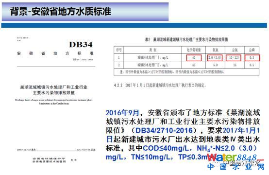 首先是背景,地處巢湖的合肥對(duì)提標(biāo)改造有龐大的需求。要想把巢湖治理好,首先要把合肥市的三條河(南淝河、十五里河和派河)治理好,要想把三條河治理好,其中一項(xiàng)就是污水升級(jí)改造,這得益于五六年前張悅司長(zhǎng)來(lái)到合肥對(duì)污水處理標(biāo)準(zhǔn)提升提出了更高的要求,同時(shí)合肥市建委對(duì)達(dá)到高標(biāo)準(zhǔn)的污水處理廠(chǎng)采取了獎(jiǎng)勵(lì)政策,政府的要求和對(duì)標(biāo)準(zhǔn)提升的獎(jiǎng)勵(lì)促進(jìn)了合肥市污水處理廠(chǎng)標(biāo)準(zhǔn)的提升。剛才我們同行介紹了北京和天津的標(biāo)準(zhǔn),COD達(dá)到30mg/L,SS達(dá)到5mg/L,BOD是6mg/L。當(dāng)時(shí)安徽省制訂標(biāo)準(zhǔn)的時(shí)候,我們參考了北京和天津市的標(biāo)準(zhǔn),以及日本琵琶湖流域的地方標(biāo)準(zhǔn)和歐美國(guó)家的一些標(biāo)準(zhǔn),針對(duì)安徽省對(duì)巢湖流域的需求,巢湖流域主要的污染物不是COD、BOD和SS,而是總氮和總磷,以及氨氮,巢湖流域地方標(biāo)準(zhǔn)COD定為40mg/L,BOD和SS達(dá)到一級(jí)A標(biāo)準(zhǔn)即可。因?yàn)榘钡_(dá)到2mg/L以下時(shí),剩余的COD主要是難降解COD,排到水體里不會(huì)造成溶解氧的降低,不會(huì)對(duì)河流產(chǎn)生影響,BOD和SS這時(shí)候排到河里也不會(huì)對(duì)生態(tài)環(huán)境產(chǎn)生任何影響。如果將BOD和SS控制過(guò)低就需要脫氮除磷之后再加高級(jí)氧化,加臭氧,加活性炭等等這些措施。而這些工藝流程往往是自來(lái)水處理過(guò)程中尤其是直飲水需要增加的工藝單元,我們喝的自來(lái)水的處理過(guò)程尚且沒(méi)有增加這樣的工藝流程,在管網(wǎng)不完善的前提下,污水處理廠(chǎng)增加后續(xù)高級(jí)氧化等流程對(duì)生態(tài)環(huán)境意義不大。安徽省的地方標(biāo)準(zhǔn)考慮沒(méi)有進(jìn)一步對(duì)BOD、SS進(jìn)一步提高要求。本次交流介紹的技術(shù)研究和應(yīng)用就是在這個(gè)標(biāo)準(zhǔn)基礎(chǔ)上開(kāi)展的。