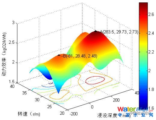 每一個(gè)工況都要把池子里的清水中的氧消掉,然后把曝氣機(jī)開(kāi)啟,測(cè)氧氣上升過(guò)程與時(shí)間變化規(guī)律,得到動(dòng)力效率和轉(zhuǎn)速和浸沒(méi)深度的關(guān)系的一個(gè)點(diǎn)。通過(guò)幾十個(gè)不同工況點(diǎn)的檢測(cè),然后通過(guò)大數(shù)據(jù)分析和模擬,才能把整個(gè)曲面做出來(lái)。