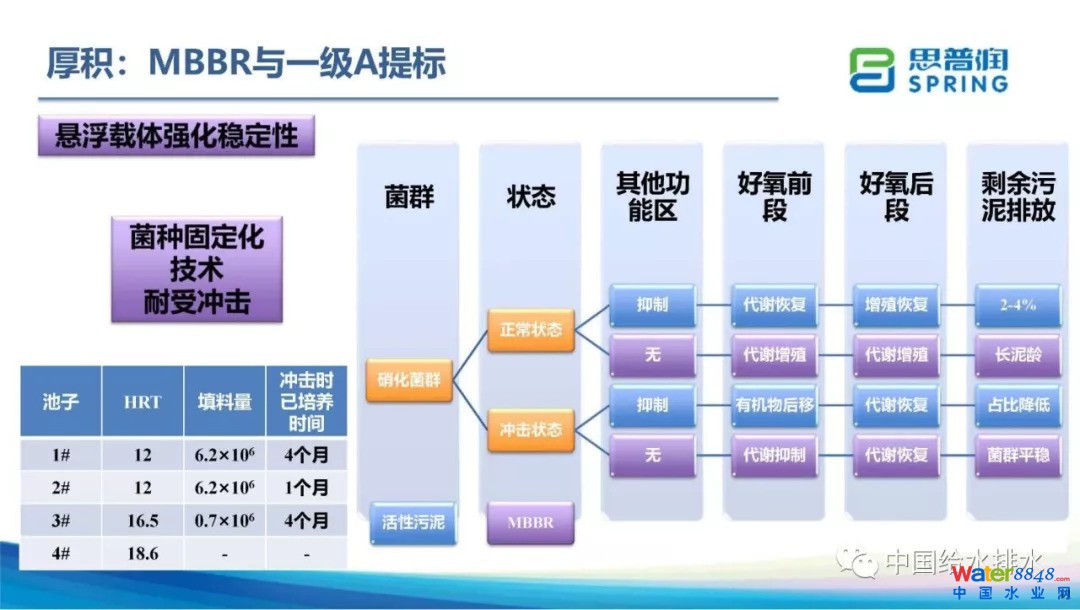 說(shuō)完強(qiáng)化硝化,再舉一個(gè)MBBR強(qiáng)化穩(wěn)定性的例子。我們?cè)陂L(zhǎng)三角有個(gè)污水廠,有四組池子,是先后建設(shè)的,不同的停留時(shí)間要達(dá)到一級(jí)A所需要的填料量也是不同的,并且整個(gè)改造也是有先有后,填料的成熟度也不同,當(dāng)水廠遇到很強(qiáng)的沖擊后,很明顯的能感受到懸浮載體投加量比較多,投加時(shí)間比較長(zhǎng)的,其處理效果也比較穩(wěn)定,耐沖擊性能強(qiáng)。分析原因,MBBR是一種菌種固定化技術(shù),水廠受沖擊最主要的就是活性污泥,其硝化細(xì)菌在沖擊的過(guò)程中逐步流失,而MBBR很好的將硝化菌群固定,能夠保證較好的抗沖擊性能。