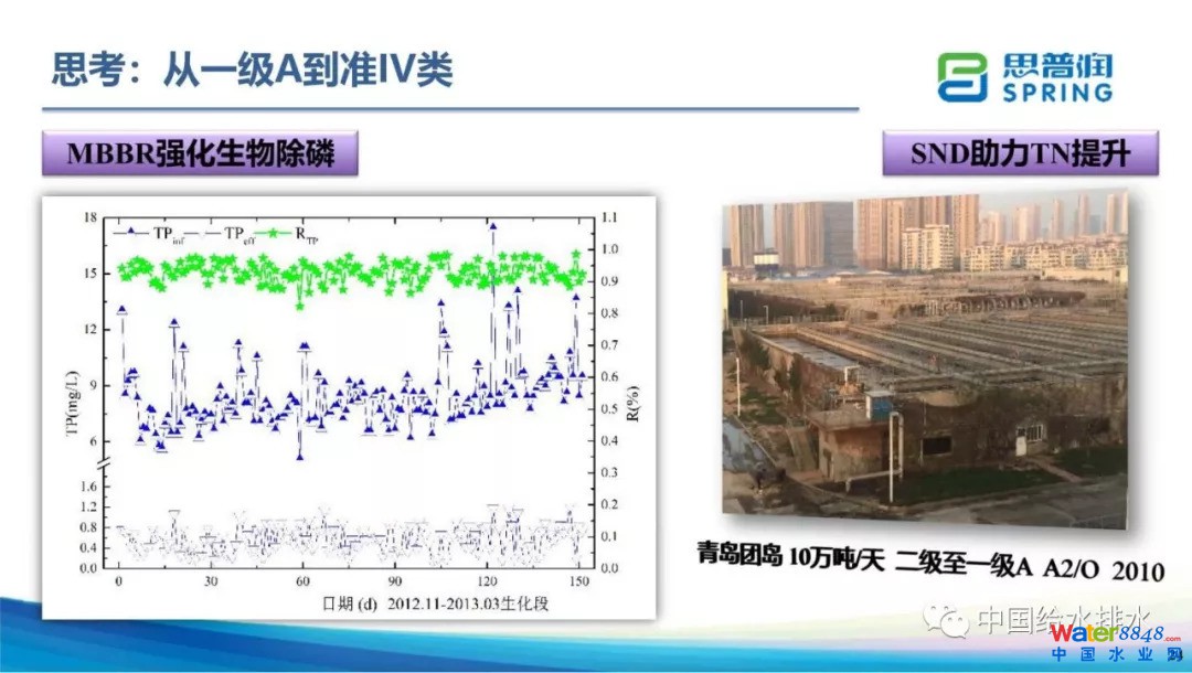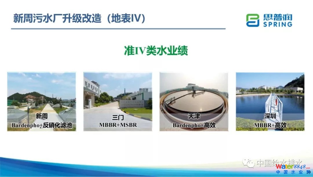 準(zhǔn)IV類(lèi)主要提幾個(gè)業(yè)績(jī),李村河污水廠。雖然是按照一級(jí)A進(jìn)行設(shè)計(jì),但是已經(jīng)考慮到了后續(xù)的提標(biāo)。我們進(jìn)行了池容的開(kāi)發(fā),從原來(lái)的好氧池需要推流器的循環(huán)流動(dòng)池型到微動(dòng)力混合池型,可以節(jié)約將近10%的能耗。微動(dòng)力混合池型作為我們的技術(shù)升級(jí)目前也已經(jīng)用于一百多萬(wàn)噸水的處理過(guò)程,該池型流化狀態(tài)非常好,沒(méi)有填料堆積的情況發(fā)生。寧波新周是我們準(zhǔn)IV類(lèi)水的業(yè)績(jī)。新周污水廠是半地下的污水廠,主要難點(diǎn)就是TN要降低至10mg/L,我們延續(xù)了李村河的技術(shù)路線,將氮磷指標(biāo)都?jí)旱缴,深度處理保障相?yīng)指標(biāo)的去除。在正常不加碳源的時(shí)候,整個(gè)夏季的時(shí)候TN是能夠完全達(dá)到10mg/L的,而冬季會(huì)略微超了一點(diǎn),通過(guò)投加碳源后可以達(dá)標(biāo)。這個(gè)是對(duì)比連續(xù)兩年的改造效果。我們的準(zhǔn)IV類(lèi)業(yè)績(jī)包括新周、三門(mén)、天津和深圳,F(xiàn)在已經(jīng)做了將近10例,積累了大量的經(jīng)驗(yàn)。我們?cè)诿鎸?duì)準(zhǔn)IV類(lèi)的時(shí)候,通過(guò)微動(dòng)力混合池型,SND的加載以及Bardenpho和MBBR的整合形成了我們MBBR+的技術(shù),共同助力準(zhǔn)IV類(lèi)水的提標(biāo)。