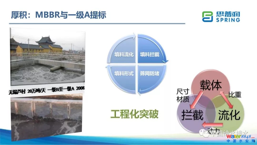 我們當(dāng)時(shí)克服的是工程化的突破問(wèn)題,防止出現(xiàn)失敗案例,如何解決填料攔截篩網(wǎng)的問(wèn)題。非常感謝無(wú)錫蘆村,這是我們第一個(gè)工程案例,也是國(guó)內(nèi)首座將MBBR工藝應(yīng)用于大型污水處理廠的案例,我們?cè)谶@個(gè)案例中解決的就是水力學(xué)方面的問(wèn)題,讓我們認(rèn)識(shí)到載體、攔截和流化三者之間的關(guān)系,載體的尺寸和材質(zhì)決定了攔截形式,流化又為防堵提供了動(dòng)力來(lái)源,載體的比重和流化的設(shè)計(jì)是相互影響的。