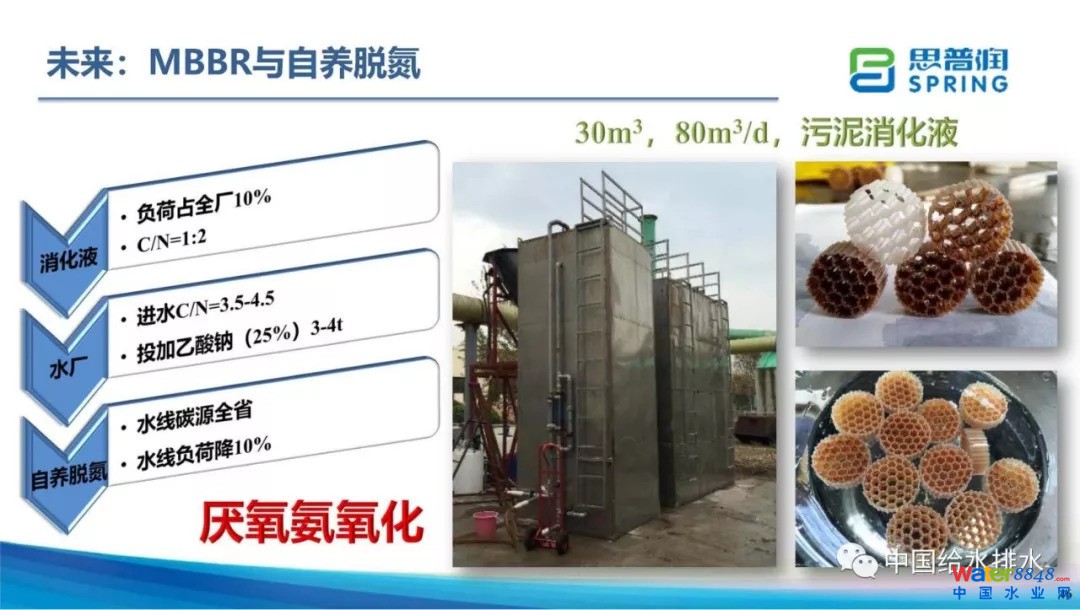 未來(lái)我們倡導(dǎo)污水廠的節(jié)能降耗,那么厭氧氨氧化工藝無(wú)疑是非常好的選擇。我們已經(jīng)在團(tuán)島展開(kāi)了厭氧氨氧化的中試。我們分析,團(tuán)島的消化液占全廠負(fù)荷的10%,C/N比為0.5,而主流投加碳源量在3~4t,通過(guò)核算,碳源的投加幾乎全部用于去除消化液總的氮,如果我們采用厭氧氨氧化技術(shù)去除掉消化液中的氮,水線不僅可以降10%,而且可以節(jié)約全部水線的碳源投加。所以厭氧氨氧化工藝顯然是非常有前景的。目前我們也正在籌劃工程的落地。