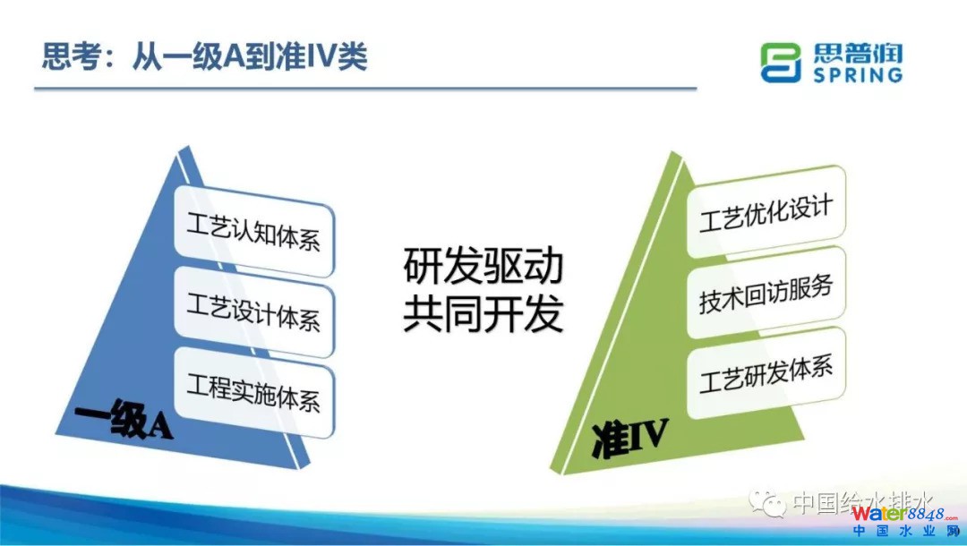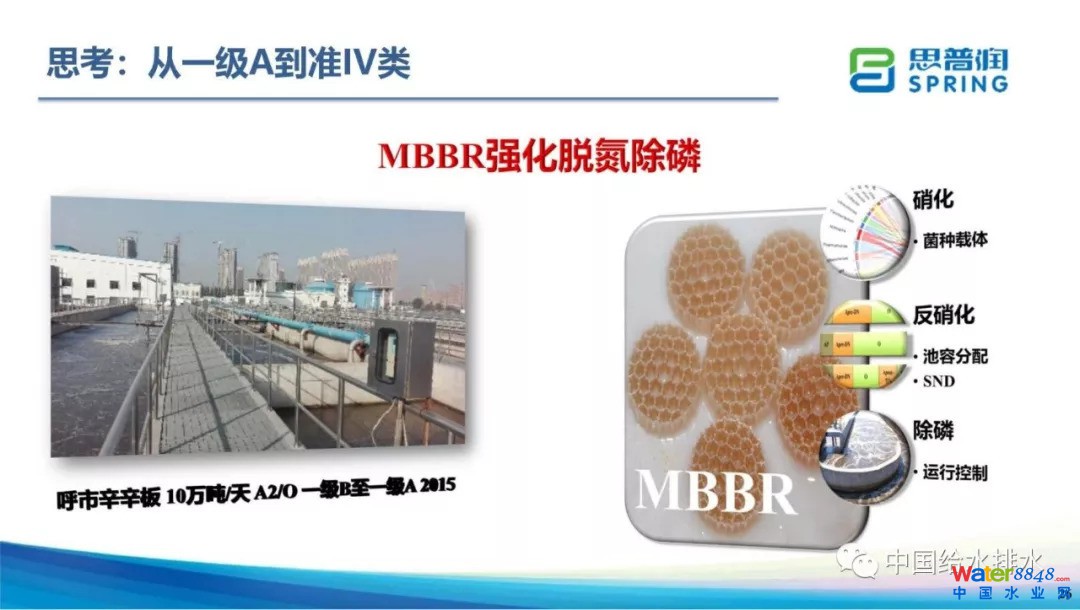 經(jīng)過(guò)我們?cè)谝患?jí)A的眾多實(shí)踐,我們形成了5條升級(jí)改造的技術(shù)路線,也基本上是MBBR改造大家都認(rèn)可的一個(gè)標(biāo)準(zhǔn)。從一級(jí)A到準(zhǔn)IV類(lèi),我們可以明顯的看到,我們一級(jí)A的時(shí)候是靠工程來(lái)驅(qū)動(dòng)的,而到準(zhǔn)IV類(lèi)則是從我們技術(shù)研發(fā)來(lái)驅(qū)動(dòng),通過(guò)我們對(duì)一級(jí)A案例的不斷回訪和優(yōu)化,總結(jié)經(jīng)驗(yàn)歸納設(shè)計(jì),與業(yè)主共同進(jìn)行MBBR工藝的二次開(kāi)發(fā)。