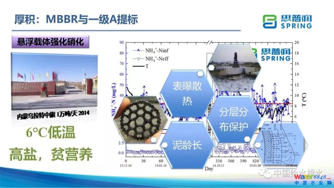 比如烏拉特中旗的案例,6℃低溫下采用MBBR工藝改造后能夠穩(wěn)定達(dá)標(biāo)。主要在于懸浮載體的污泥齡特別長(zhǎng)以及微生物分層分布的保護(hù)效果,此外在改造過(guò)程中我們把氧化溝的表面曝氣改為了底部曝氣,也有利于溫度的控制。類(lèi)似,像高鹽、貧營(yíng)養(yǎng)的水質(zhì)都是活性污泥法所不擅長(zhǎng)的,而MBBR則可以很好的應(yīng)對(duì)。