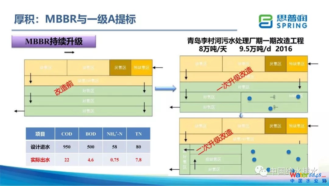 對(duì)于一級(jí)A的改造,在2015年思普潤(rùn)就已經(jīng)積累了80項(xiàng)工程案例,500萬(wàn)噸水質(zhì)。涵蓋了各類(lèi)池型的改造,積累了豐富的經(jīng)驗(yàn);仡櫼患(jí)A的改造,實(shí)際上是從我們先開(kāi)始工藝實(shí)施,建立設(shè)計(jì)體系,然后再更深入的理解工藝,知道了MBBR的技術(shù)核心在于懸浮載體比重和材質(zhì)、懸浮載體設(shè)計(jì)參數(shù)、懸浮載體的攔截和懸浮載體的流化。并且確定了思普潤(rùn)MBBR工藝包。