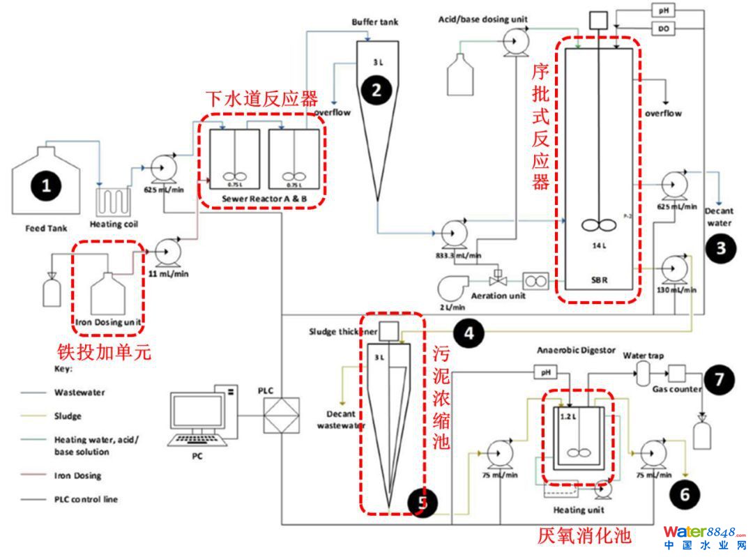 本研究旨在全面研究并評(píng)估下水道中投加的鐵鹽對(duì)城市污水排放與處理系統(tǒng)的總體影響效應(yīng),包括對(duì):(1)下水道中硫化物控制;(2)廢水處理過程中磷的去除;(3)厭氧消化池生產(chǎn)的沼氣中的H2S控制。實(shí)驗(yàn)室建立了兩個(gè)連續(xù)流的模擬城市污水系統(tǒng),包括下水道反應(yīng)器,用于生物去除有機(jī)碳和氮的序批式反應(yīng)器(SBR),污泥濃縮池和厭氧消化池(如圖1)。其中一個(gè)系統(tǒng)作為對(duì)照,另一個(gè)系統(tǒng)連續(xù)投加10mg/L的FeCl3作為實(shí)驗(yàn)系統(tǒng)。