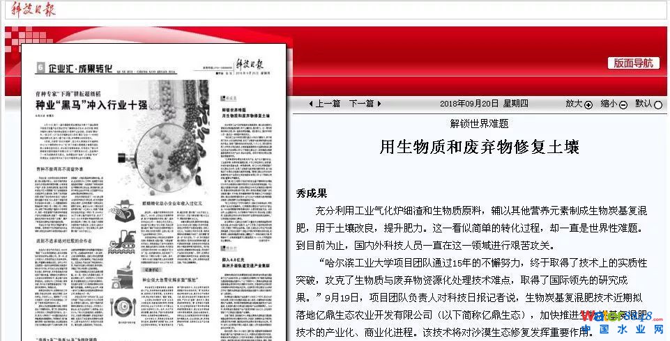 《科技日報》2018年9月20日(第6版:企業(yè)匯·成果轉化)刊發(fā)了題為“解鎖世界難題,用生物質和廢棄物修復土壤”的報道。