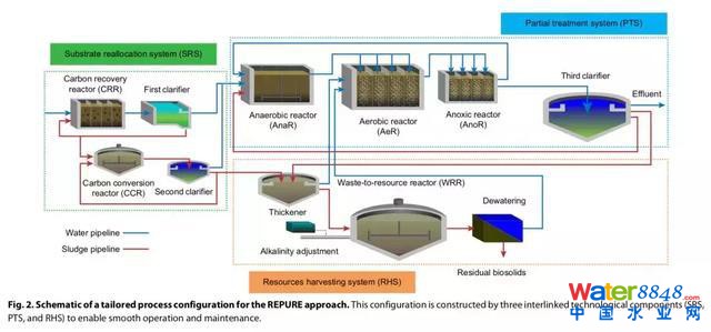 圖 | 基于 REPURE 的污水處理系統(tǒng)新框架。主要包括碳源再生系統(tǒng)(SRS)、污水處理系統(tǒng)(PTS)、資源回收系統(tǒng)(RHS)三大模塊。(圖源:Science Advances)